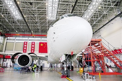国产大飞机C919停放在中国商飞公司试飞中心祝桥基地机库内。 4月18日,C919大型客机首飞放飞评审会在中国商飞公司试飞中心召开。经过严格评审,评审委员会一致同意,C919大型客机首架机通过首飞放飞评审,待完成全部高速滑行测试后,可择机开展首飞。这标志着C919大型客机首架机的首飞又迈出了重要一步。 据介绍,此次评审是继3月20日通过了首飞技术评审后,C919大型客机完成的首飞前最后一项评审任务。 新华社记者 丁汀 摄