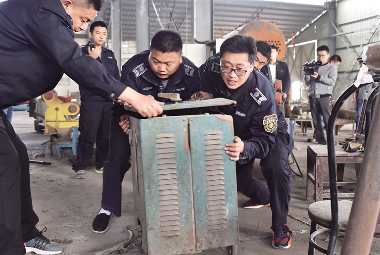 济南市、历城区两级环保部门组织50多名人员和3台大型机械拆除绿杰公司小锅炉,封存生产设备。