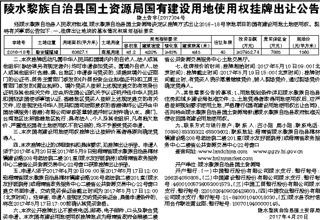 陵水黎族自治县国土资源局国有建设用地使用权挂牌出让公告