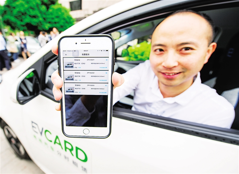 4月20日,一名技术人员在演示通过“E+租车”APP找到的附近可以使用的分时租赁电动汽车信息。 当日,电动汽车、充电桩一体化运营的分时租赁平台——“E+租车”平台在重庆上线运营。目前已接入力帆盼达用车、重庆交运智道出行、环球车享EVCARD三大运营商,建成近300个分租网点,并累计接入近4000辆纯电动汽车。 需要使用分时租赁业务的用户,只需下载一个“E+租车”APP,就可以任意租用上述多个分时租赁品牌的纯电动车。作为一种新型的绿色、低碳、便捷出行方式,电动汽车分时租赁受到越来越多人欢迎。新华社记者 刘潺 摄