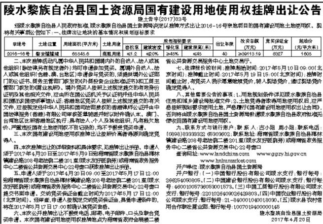 陵水黎族自治县国土资源局国有建设用地使用权挂牌出让公告