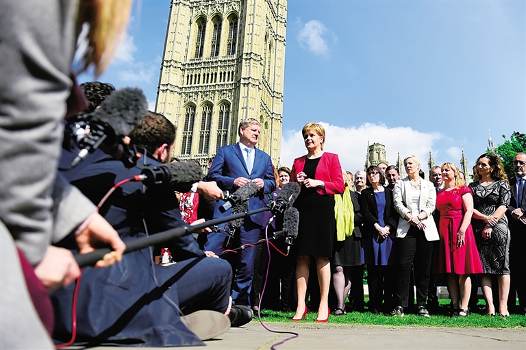4月19日,在英国伦敦,苏格兰政府首席大臣妮古拉·斯特金(前排右)在议会大厦外接受采访。 英国议会下院19日举行投票,结果以压倒性多数通过了提前举行大选的动议。英国将在6月8日举行大选。 新华社发