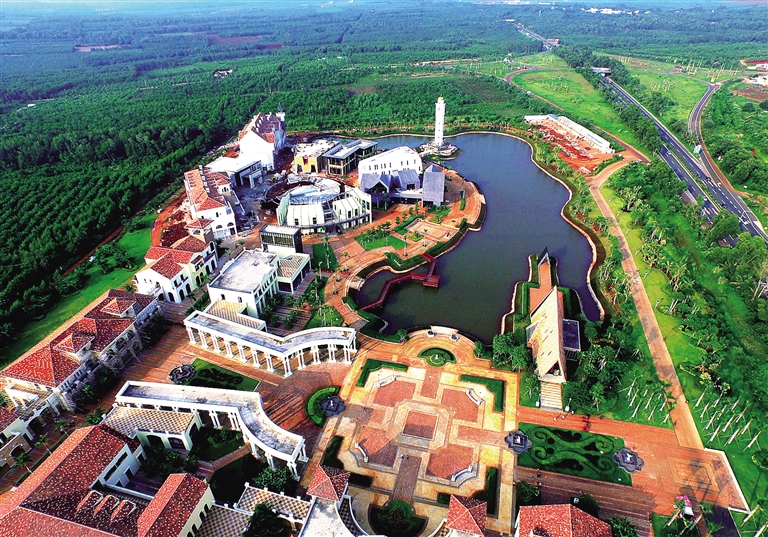 沿环岛西线高速行驶,在儋州市光村镇入口1公里处北望,一座具有欧式建筑风格的小城矗立在一片原野中。这里就是正在建设中的儋州特色小镇——光村雪茄风情小镇。