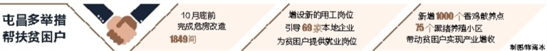 在发展重点产业方面,屯昌继续推进全县域生态循环农业香鸡养殖和黑猪养殖重点产业发展,在3月底完成1000个香鸡鸡舍,与贫困户签订三方协议,按时发放香鸡种苗、提供养殖技术,完成25个黑猪养殖小区基础设施建设并投入使用,确保2017年底香鸡出栏两批次、黑猪出栏一批次,产生经济效益,带动1300户左右贫困户实现产业增收脱贫;在现有基础上,新增1000个香鸡散养点,75个黑猪养殖小区,力争做到每个行政村都覆盖。此外,屯昌还将继续实施教育帮扶、健康扶贫、社会保障兜底、电视夜校特色教学等措施全覆盖。