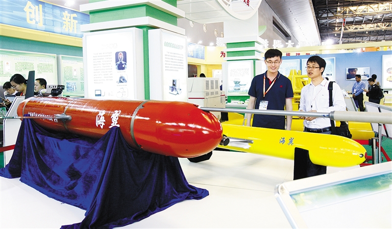 4月20日,人们在上交会上观看名为“海翼”水下滑翔机的新型水下机器人。 当日,第五届中国(上海)国际技术进出口交易会(简称上交会)在上海世博展览馆拉开帷幕。本届上交会为期3天,展出面积3.5万平方米,主题为“创新驱动发展、保护知识产权、促进技术贸易”。