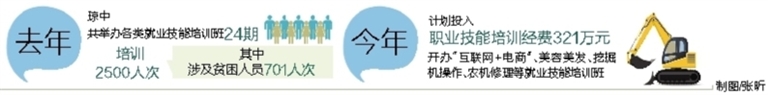 据了解,今年琼中计划投入职业技能培训经费321万元,加大对贫困户技术培训的帮扶力度。“我们根据报名人数多少、居住是否集中等情况,采取集中培训和入户培训两种方式,对村民进行专业技能培训。”黄良梅说,县就业局将结合乡村旅游、贫困户产品购销,开展“互联网+电商”、美容美发、挖掘机操作、农机修理等就业技能培训班,做好就业技能扶持工作。