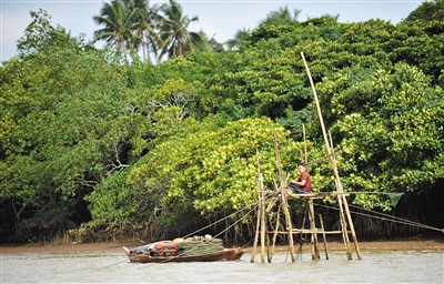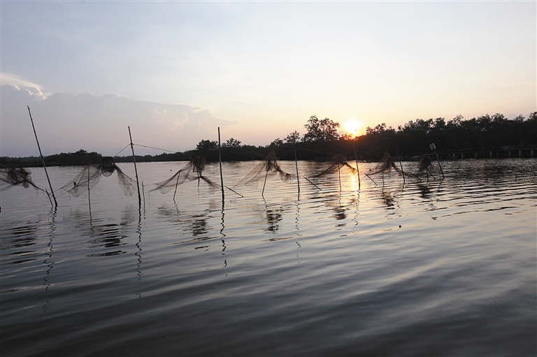 文昌市八门湾的红树林风光旖旎,千姿百态,让观光旅游者大饱眼福。红树下盘根错节的根和滩涂,孕育了丰富的海洋生物。文昌市文城镇头苑村委会霞场一村的村民陈明山告诉记者,正是红树林得天独厚的条件,赋予了居住在其周边渔民们丰富的渔业资源,从而形成了以红树林为中心的捕捞方式。