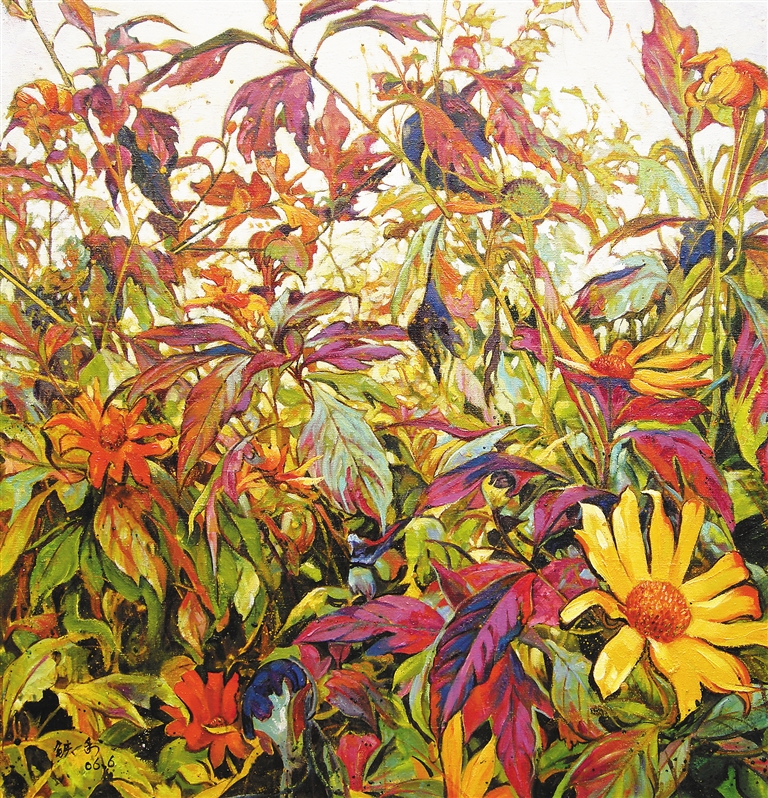 “海南光照强烈,在阳光的斑驳下,这些野生植物会显得极有色彩冲击力,带给画家无尽的创作灵感。”周铁利的油画作品《争艳》和《野菊》均有一米高一米宽,无论是构图,还是用色,都相当明艳动人,令野菊花的勃勃生机迎面扑来。“像《争艳》,我就是凭借着自己直观的印象感受创作的,很有冲击力。”