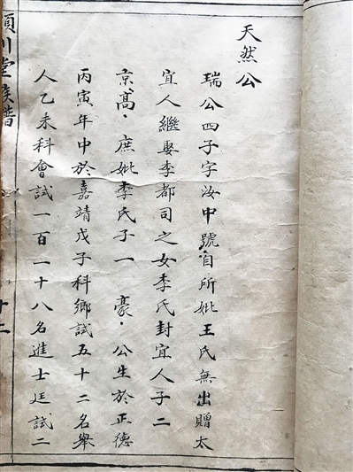 这册族谱在陈天然父亲陈瑞“行略”一页的右侧,有4个小字“登高薄暮”,旁边纸面上则是一片空白,这种现象为其他页面上所没有,陈氏后人也不明其中含意,倒成了一个小小的谜。或许修谱者要在那里誊抄诗歌一首,又或许感慨陈瑞因儿子当官,被朝廷封赠为“奉政大夫、户部郎中”时年事已高?