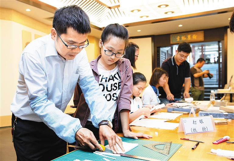 4月23日,在省图书馆古籍部,市民在图书馆专业人士的指导下,体验线装古籍装帧制作技艺。