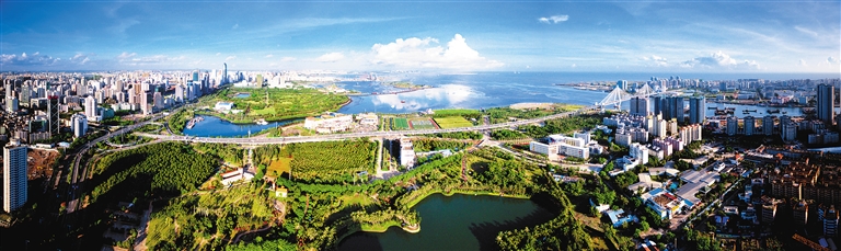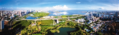 | 俯瞰海口湾,万绿园、世纪公园、滨海公园三园合一。近年来,海口市通过找差距、补短板,在经济建设等方面下硬功夫,城市面貌焕然一新。 本报记者 李幸璜 摄 |