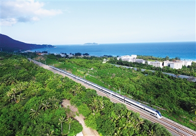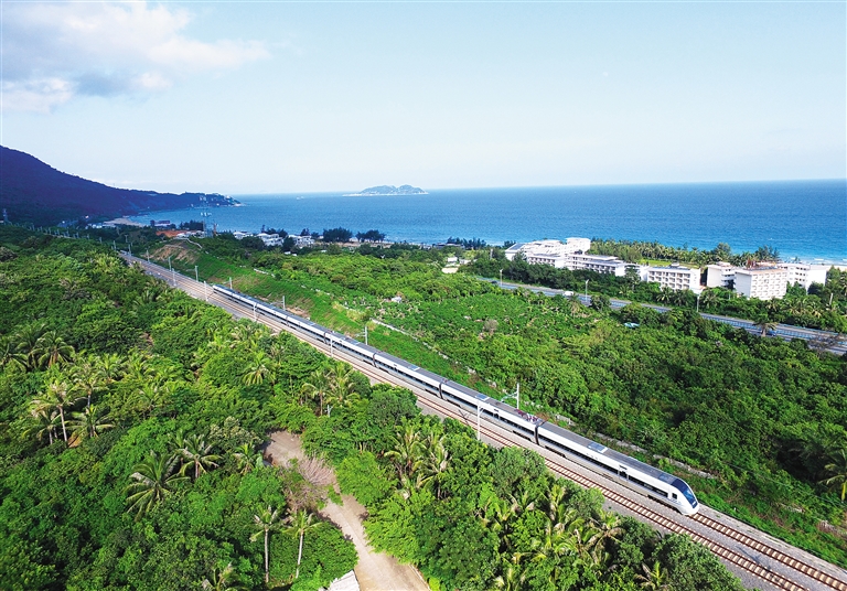 | 陵水香水湾,一列高速行驶的动车在如画的美景中呼啸而过。随着环岛高铁的贯通,老百姓出行越来越方便。本报记者 王凯 摄 |