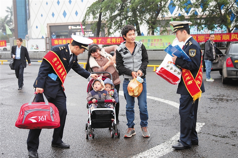 | 海口青年志愿者在2017年春运时为过海旅客送上温暖。