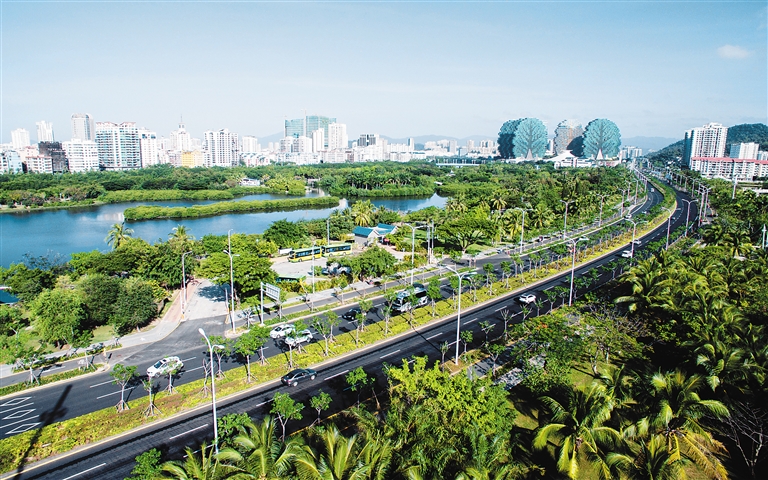 | 为提升道路景观品质,三亚市将凤凰路等列入“双修”工作内容。俯瞰凤凰路南段,风景如画,以崭新的面貌迎接八方游客。本报记者 武威 摄 |