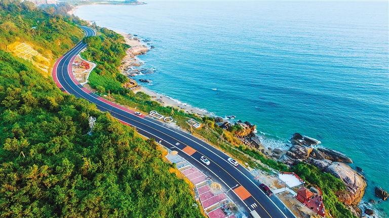 | 鸟瞰万宁石梅湾至大花角滨海旅游公路。这条被誉为“会讲故事的旅游公路”,全线串联了多个美丽海湾。 本报记者 张茂 摄 |