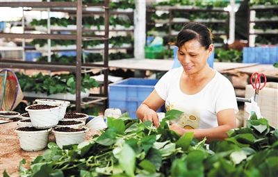 | 位于东方市的上彩绿萝种植基地工人正在扦插绿萝苗。该基地解决了500多名农民就业,帮助当地贫困户脱贫。 本报记者 苏晓杰 摄 |