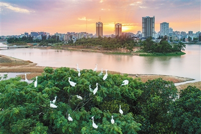 | 海口市用生态治水理念指导美舍河治理,水质、生态修复见成效,引来白鹭歇息。