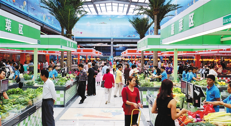 | 位于三亚市荔枝沟路的新型大型综合农贸市场——乐天城农贸市场,告别了以往的脏乱差,采用智能化管理,市民购物环境整洁、消费方便。本报记者 袁宇 摄 |