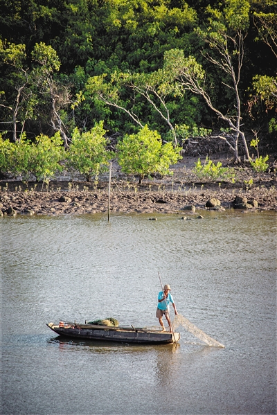 在红树林这种浅滩捕捞,渔民们一般会划着4至6米长的小船进入,最大的船也不足10米。
