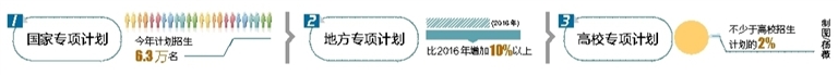 今年,重点高校通过国家专项计划、地方专项计划、高校专项计划继续在琼招收农村和贫困地区学生。其中,国家专项计划由中央部门高校和地方重点高校为主的本科高校承担,面向全国国家级贫困县定向招生。全国安排招生计划6.3万名;地方专项计划由我省的海南大学、海南师范大学、海南医学院等招生高校承担,实施招收我省农村区域学生的专项计划。2017年安排招生计划原则上比2016年增加10%以上。两项计划下达海南的招生计划均由省考试局通过《填报志愿指南》专刊向广大考生公布。