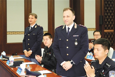 4月24日,参加中意警务联合巡逻的警员(前排)在北京出席启动仪式。 当日,中意警务联合巡逻启动仪式在公安部举行。从4月24日至5月7日,来自意大利的4名警员将与中国公安民警在北京和上海有关旅游景区开展为期两周的联合巡逻,意方警员将协助中方警员处理与意大利游客安全有关的问题。此后,中国公安民警将于6月初赴意大利,与意警方在当地开展联巡。 新华社发