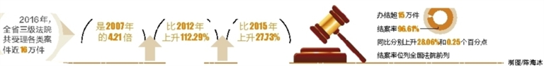 一组数据能见证其中变化:2016年,全省三级法院共受理各类案件近16万件,是2007年的4.21倍,比2012年上升112.29%,比2015年上升27.73%;办结超15万件,结案率96.61%,同比分别上升28.06%和0.25个百分点,结案率位列全国法院前列。