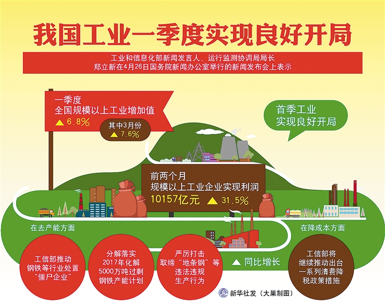 郑立新说,一季度,我国工业生产增速企稳回升,企业效益持续改善,新旧动能转换有序推进,市场预期明显增强,信息消费对经济增长拉动作用增强,工业生产和企业效益状况好于预期。从整体情况看,工业整体企稳,传统产业运行平稳,工业大省持续发挥支撑作用。