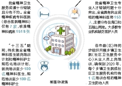 我省精神卫生工作起步较晚,整体投入不足,防治机构和专业人员缺乏,精神病专科医疗机构收治床位短缺,精神疾病社区管理和康复仍是空白等问题较为突出。为了进一步提升精神障碍的预防、治疗和康复工作水平,我省近期印发《海南省精神卫生事业发展“十三五”规划》。