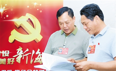 | 4月26日,来自昌江的基层代表李圣皇(左一)、林文光围绕如何狠抓精准扶贫,加快群众增收致富步伐展开讨论。 本报记者 李英挺 摄 |