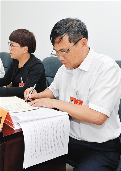 | 4月26日,来自儋州白马井中学的代表李郁林(右一)认真准备发言材料。本报记者 王凯 摄 |