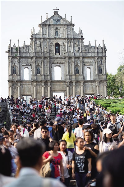 4月30日,游客在澳门大三巴牌坊游览。 “五一”小长假期间,人们以各种方式放松心情、欢度假日。 新华社记者 张金加 摄