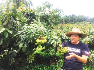 简德厚1997年来海南做农业,在保亭、定安等地种过香草兰、管理过红毛丹基地,2014年来儋州包这300亩荔枝园。以前这荔枝园承包户年年亏钱,他来后改进管理,2015年就赚钱;2016年,附近荔枝种植户普遍大幅减产,他亩产依然超过2500斤,他帮助技术指导的种植户亩产也有2000斤。