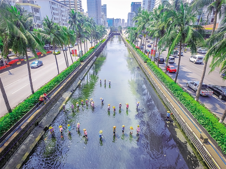 5月3日,海口市龙昆北路龙昆沟,水上清洁队正在排查排污破损情况,进行清淤,并清理垃圾。