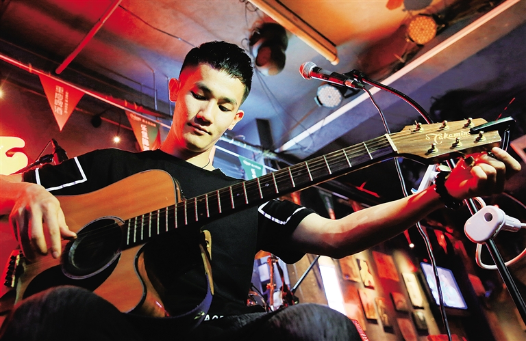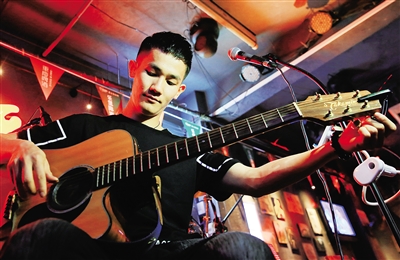 在广西柳州市融水苗族自治县,有一个名叫“现场”的乐队。乐队总监韦鹏是一位苗族青年,自小喜爱音乐,曾在广州、深圳等地担任伴奏乐手和驻唱歌手。2013年,韦鹏回到家乡开办琴行,结识了当地一批音乐爱好者,组成了“现场乐队”,并创办了“现场酒吧”。“现场乐队”成员多为90后,有补胎工石嘉川、建筑杂工苏航、洗车工吴丽云等。白天,他们为生计而奔忙。晚上,他们先集中排练两个小时,然后演出两个小时。这样的状态在外人看来辛苦,但他们却乐此不疲。这是歌手兼吉他手苏航5月1日演出前调音。新华社发