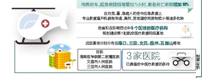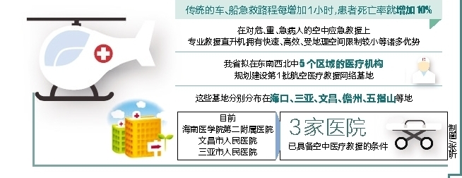 去年,为了提前谋划我省航空医疗救援体系建设,省卫计委综合我省区域卫生发展规划、医疗机构建设状况和各市县承担重大任务保障情况等因素考虑,拟在我省东南西北中五个区域的医疗机构规划建设第一批航空医疗救援网络基地,这些基地分别分布在海口、三亚、文昌、儋州、五指山等地。目前,海南医学院第二附属医院、文昌市人民医院、三亚市人民医院这3家医院已具备空中医疗救援的条件。