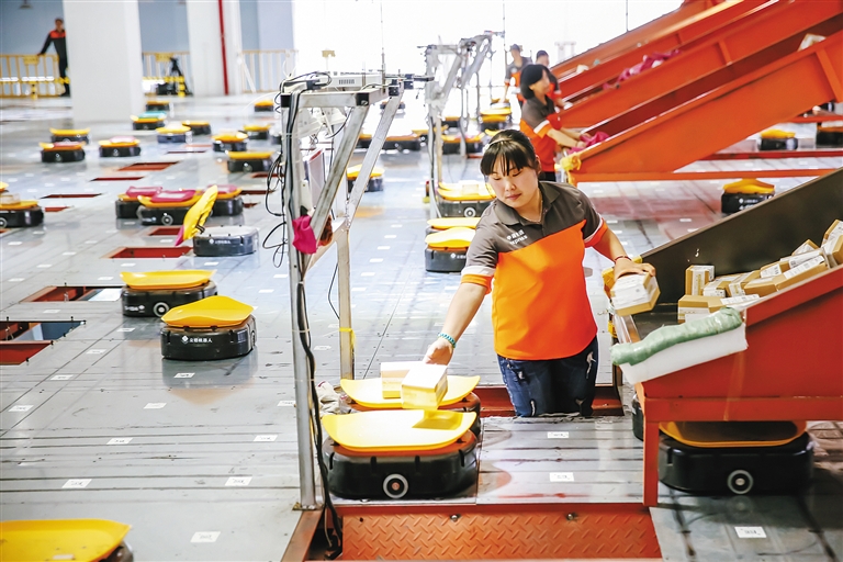 5月3日,放件员将包裹放在机器人的托盘上。 义乌申通公司的快递智能机器人分拣系统工作着700多个快递机器人,它们外观近似扫地机器人,顶部有一个活动托盘用来运载包裹。据介绍,分拣机器人主要针对重量在5公斤以下的小件包裹,集扫码、称重、分拣功能“三合一”,并且具有避障和自动寻找充电桩功能。放件员将包裹放在机器人的托盘上,面单朝上进行信息采集,后台向机器人传达路径信息。机器人沿着路径到达指定位置后,托盘翻起,快件顺着格口滑槽落入楼下的收件区。 这套智能机器人分拣系统由申通快递与浙江立镖机器人公司共同研发,目前已在义乌、天津和临沂三地的分拣仓库投入使用,分拣错误率低,效率高,可减少70%的人工。新华社发