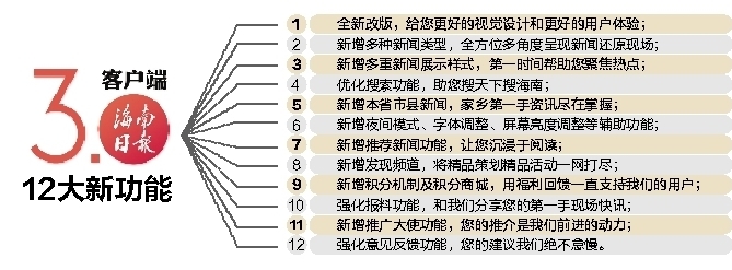 在操作及视觉体验上,海南日报客户端3.0版在首页增加“搜索”功能,同时继续优化加载速度、图集浏览,通过海南日报客户端阅读海南日报电子版将更加流畅,使严肃阅读更轻松。
