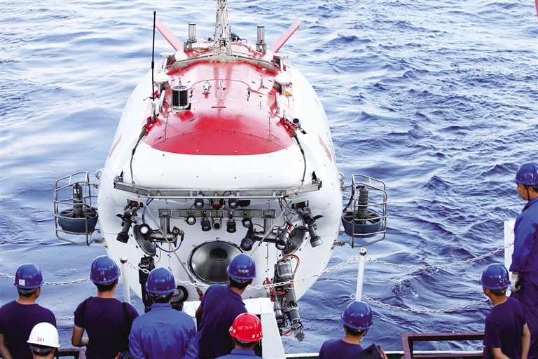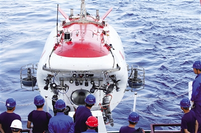 7时11分,“蛟龙”号离开“向阳红09”科学考察船到达水面,5分钟后开始下潜。8时57分,“蛟龙”号抵达2900多米的预定深度,开始作业。