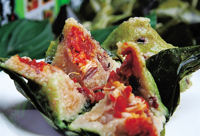 儋州粽子使用4大食材——茄冬叶、火山岩糯米、花猪肉和跑海鸭蛋黄,都是产自儋州本地的绿色产品;儋州粽子制作使用的千年传统工艺,生产过程有32道工艺需要27个小时,并且儋州粽子获批国家地理标志保护产品。