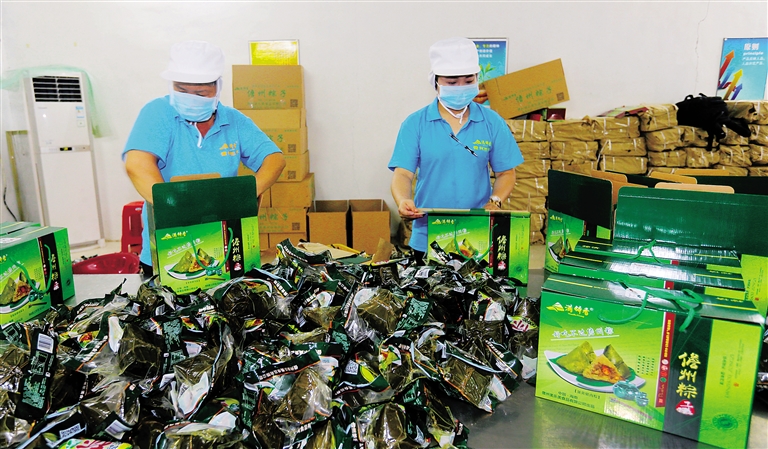 儋州美乐美食品有限公司生产的“满钵香”牌儋州粽子,目前订单近20万个。该公司总经理陈有章说,他们的客户主要在山东、河南、湖北等地,现在每天有专人负责发货。