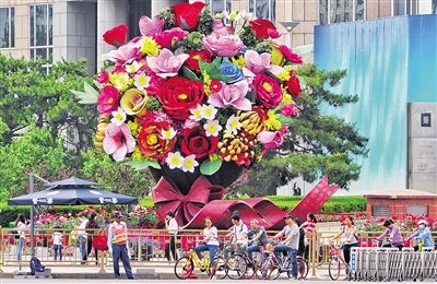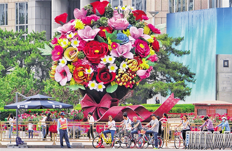 5月8日,市民骑车驶过布置在北京东长安街的“百花争艳”花坛。 近日,北京在东单路口等地布置不同样式的大型花坛,迎接即将在北京举行的“一带一路”国际合作高峰论坛。 新华社记者 李欣 摄