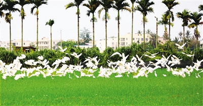 随着夏季到来,成群的白鹭在三亚水稻田间飞舞、觅食,为乡间增添勃勃生机,形成一幅美丽的生态画卷。