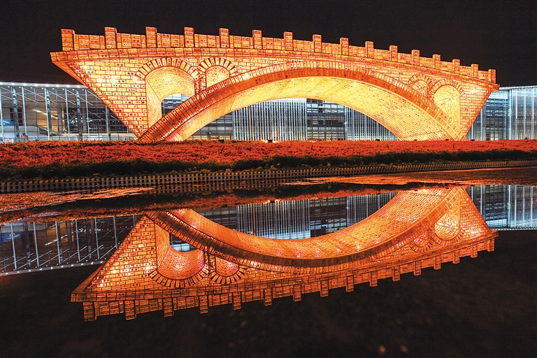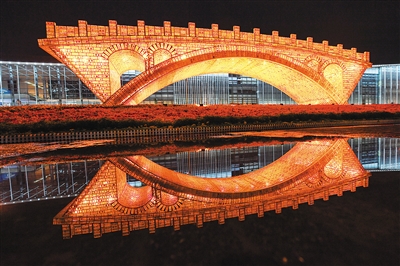 这是5月9日拍摄的“丝路金桥”景观作品。 近日,“丝路金桥”景观作品亮相北京奥林匹克公园。“丝路金桥”景观作品主体结构模仿隋代建筑赵州桥,长28米、高6米、宽4米,由2万块“长城砖”形状的人造树脂水晶砖砌成,每块砖的内部熔铸丝绸制作的手工花,是陆上和海上“丝绸之路”沿线几十个国家、近百座城市的“国花”或“市花”,寓意架设“沟通之桥”。 新华社记者 陈晔华 摄