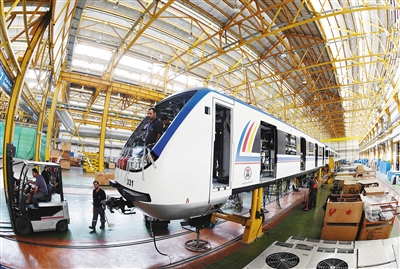 2016年9月4日,在伊朗德黑兰,工人在德黑兰轨道车辆制造公司下属轨道车辆组装厂内组装车辆。 伊朗首都德黑兰5条地铁线全部由中国公司承建,其中德黑兰地铁1、2号线由中信国际承建,3、4、5号线由北方国际承建;地铁车辆由中伊合资的德黑兰轨道车辆制造公司(由中国的北方国际合作股份有限公司、中国中车长春轨道客车股份有限公司和伊朗绿菠萝工业集团在伊朗合资成立)提供。