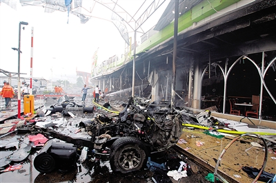 这是5月9日在泰国南部北大年府拍摄的爆炸现场。 据泰国媒体报道,泰国南部北大年府9日下午发生两起爆炸,一枚炸弹在北大年府一商场内爆炸,未造成人员伤亡,警方随后前往现场查看。在警方检查过程中,商场边一辆皮卡车的司机突然弃车并搭乘他人摩托车逃离,皮卡车随即爆炸,造成约40名警方和军方人员以及民众受伤。 新华社/路透