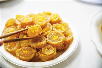 这时,便可将蛋卷条裹上生粉,放入油锅煎炸了。一份成功的风味蛋卷,口感必须外脆内嫩,在油煎过程对火候的控制尤为重要,必须小火慢煎,耐心不停地翻动蛋卷,以使其受热均匀。约20多分钟蛋卷煎熟后,均匀地裹上面包糠,切成圆块状,一道外脆内嫩,风味独特的蛋卷才算是完成了。虽然工序复杂,但店家在制作时每一步都不含糊。“做起来虽然比寻常点心麻烦多了,但为的就是这味道,味道对了,大家才爱吃。”阿清说。