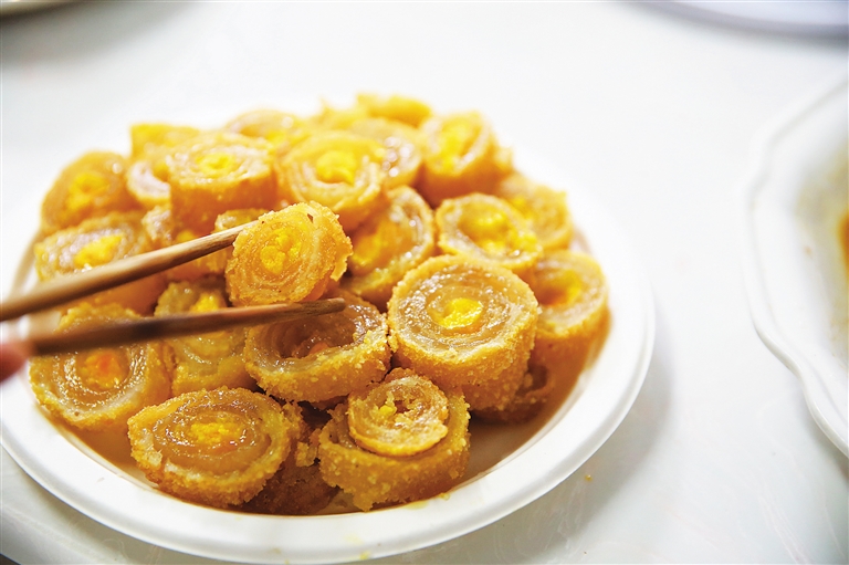 “不光颜值高,蛋卷的味道更是令人惊艳。”王先生说,趁着蛋卷刚刚出锅留有余温时入口,轻轻一咬,马上可以感觉到爽滑弹牙的嚼劲,白色的卷层清甜爽口,咸鸭蛋黄香软解腻,令人回味无穷。