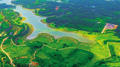 5月6日,高空鸟瞰定安南丽湖畔,一条湖畔慢道逶迤曲折,掩映花木中。据了解,在南丽湖国家湿地公园建设中共规划了全长共35.1公里环湖路及湖心路项目,已建成的环湖慢道长约8.35公里。本报记者 张茂/图 本报记者 邓钰/文
