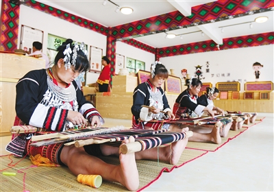 5月4日,在陵水黎族自治县本号镇大里,陵水梅雅黎锦工艺农民专业合作社的社员在织黎锦。合作社月销售额约2万元。近期政府对合作社进行扶持,鼓励社员研发黎锦旅游产品增收。本报记者 武威 通讯员 陈思国 摄