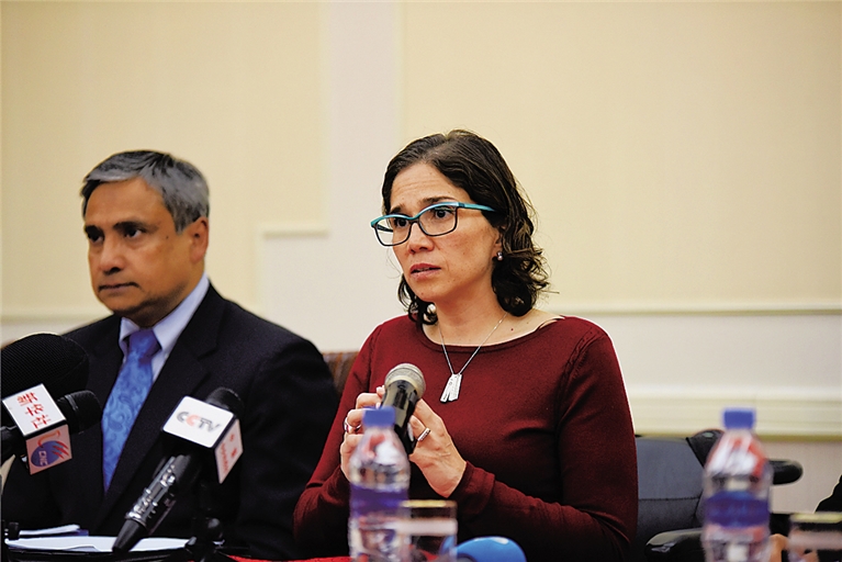 图为5月8日,联合国人权理事会残疾人权利事务特别报告员卡塔利娜·阿吉拉尔(右)在朝鲜首都平壤举行的记者会上发言。 新华社记者 程大雨 摄